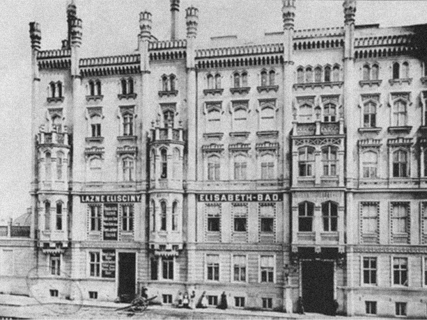 Situace kolem r. 1901. Eliščiny lázně zcela zakrývají dům č. p. 30 i barokní domek.